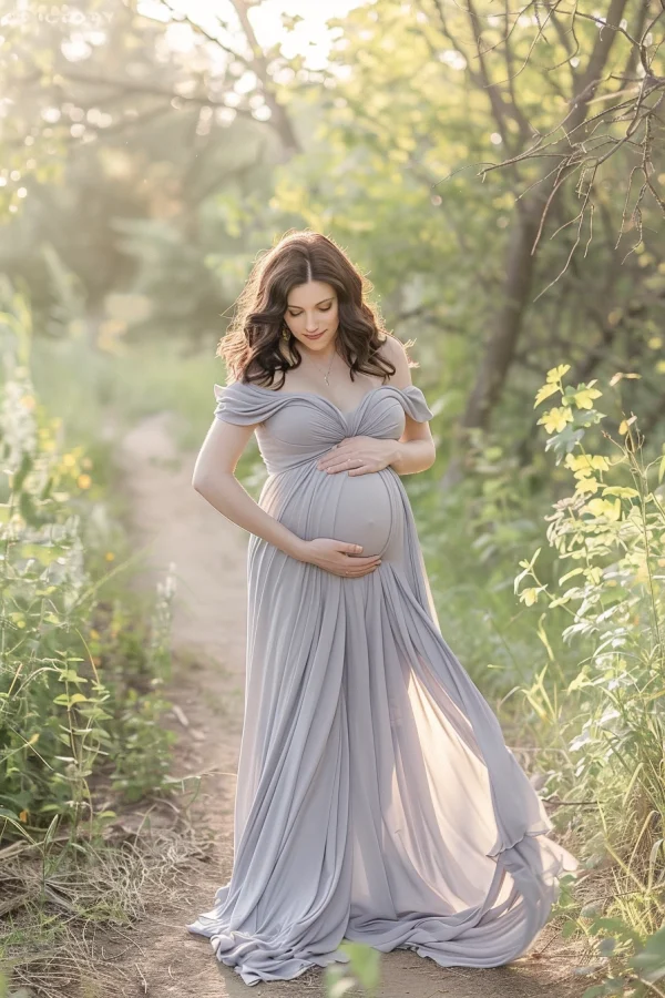 - اكشفي عن أكتافكِ المتوهجة وفتحة الصدر بينما يلائم الجزء العلوي من الفستان صدرك. ثم اتركي القماش المنسدل يتدفق فوق بطنك المنتفخ في شلالات رائعة.