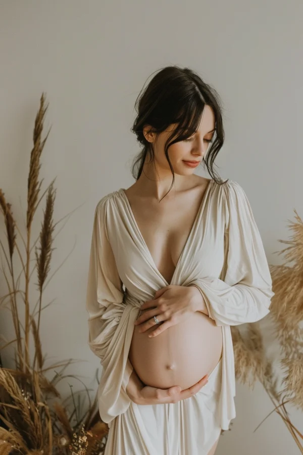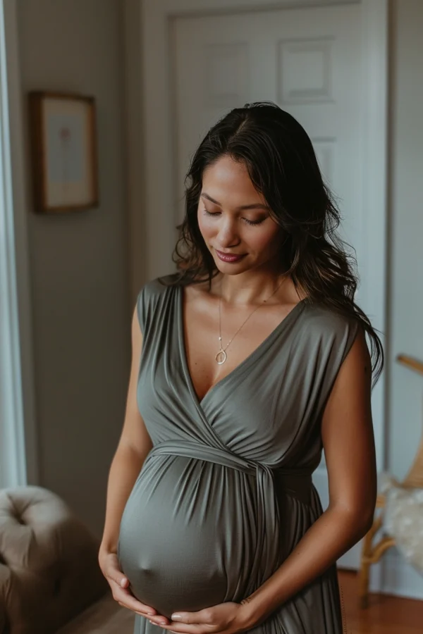 - للحصول على لمسة عصرية ومواكبة للموضة في صور الأمومة، ارتدي فستانًا أنيقًا من قطعتين
