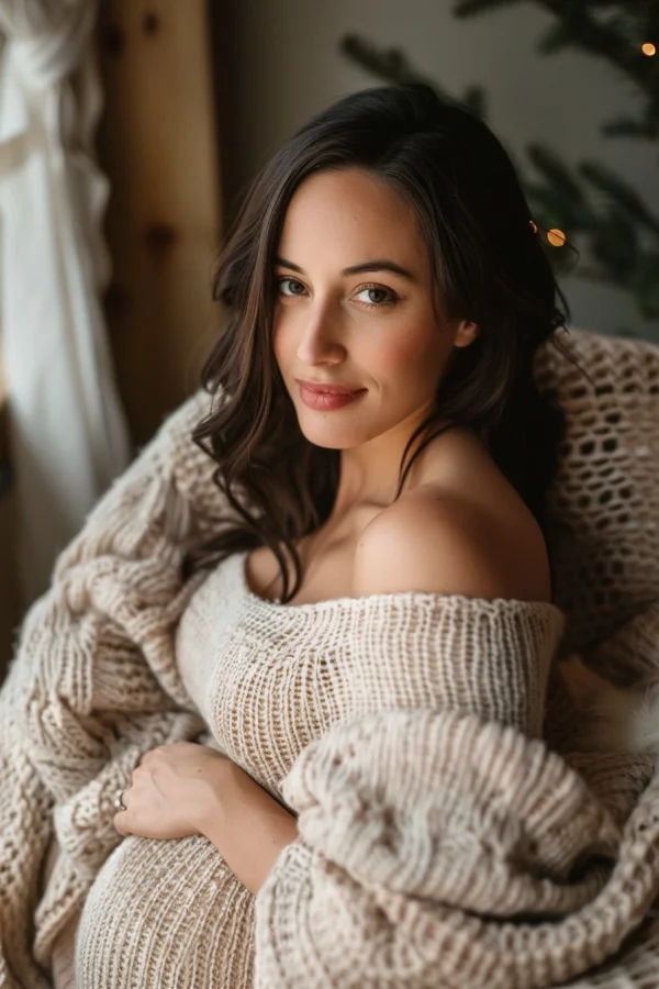- هل ترغبين في ارتداء شيء ناعم للغاية ومريح لالتقاط صور الأمومة المريحة في المنزل؟ فستان من الصوف المحبوك هو خيار رائع!