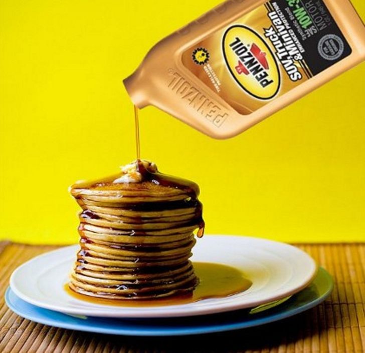 تمتص الفطائر شرابًا حقيقيًا بسرعة كبيرة جدًا للتصوير ، لذا يستبدلها المصورون بزيت المحرك وحيلة أخرى هي تغطية الفطائر برذاذ طارد للماء يخلق طبقة واقية.