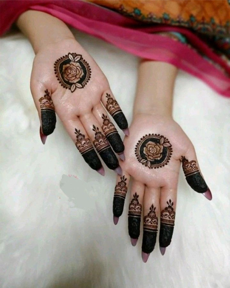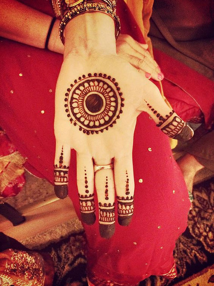 تصميم الحناء الرائج الآخر هو تصميم زهرة اللوتس. يتميز التصميم بعنصر زهرة اللوتس في المنتصف مع بعض النقاط والظلال الأخرى. يمكنك الحصول على هذا التصميم البسيط لإطلالة نافراتري النابضة بالحياة. علاوة على ذلك، فإن الجاذبية الجمالية لهذا التصميم ستكمل إطلالة غاغرا تشولي الخاصة بك.