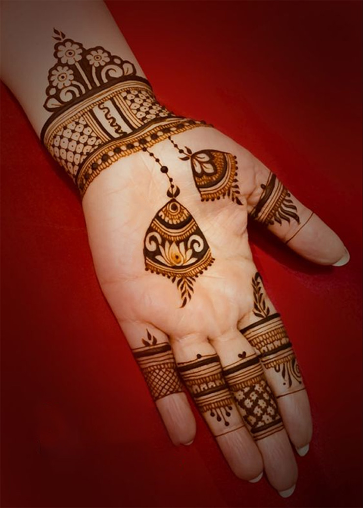 يكمل تصميم الحناء هذا بشكل مثالي يتميز التصميم بشراشيب كعنصر مميز وبعض العناصر المعقدة التي تضيف إلى جمال التصميم ، تجمع العناصر الزهرية عند المعصم وعناصر الخطوط عند الأصابع كل ذلك بطريقة جمالية للغاية.