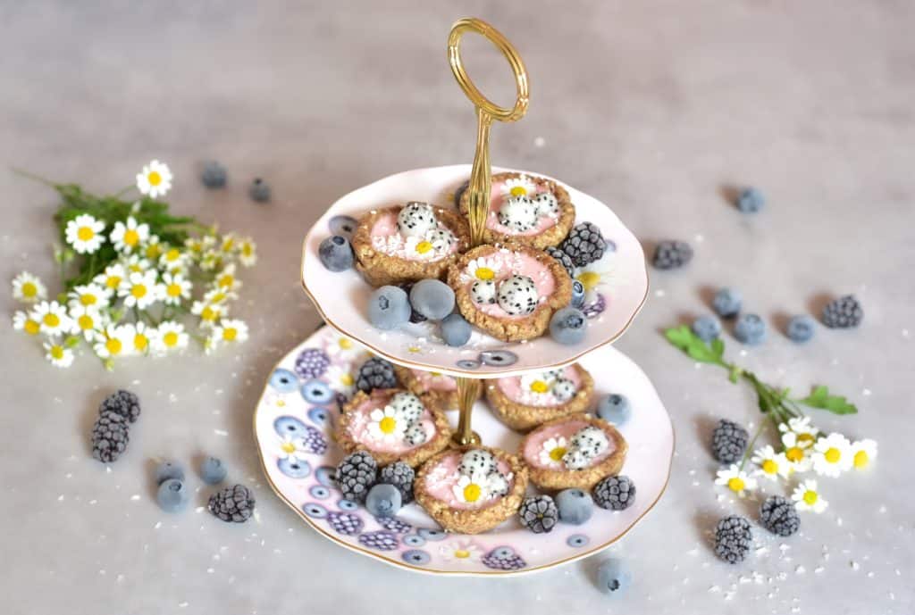 ميني تارت الورد هي عبارةعن فطائر نباتية الصغيرة لذيذة للغاية مع قشرة لوز نباتية مقرمشة غير مخبوزة واختيار نكهات توت العليق أو نكهات النعناع ، فهذه هي الحل الأمثل لشاي بعد الظهر