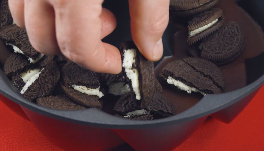 • نقطع بسكويت الأوريو إلى نصفين ونضيفها إلى الخليط المتصلب في القالب