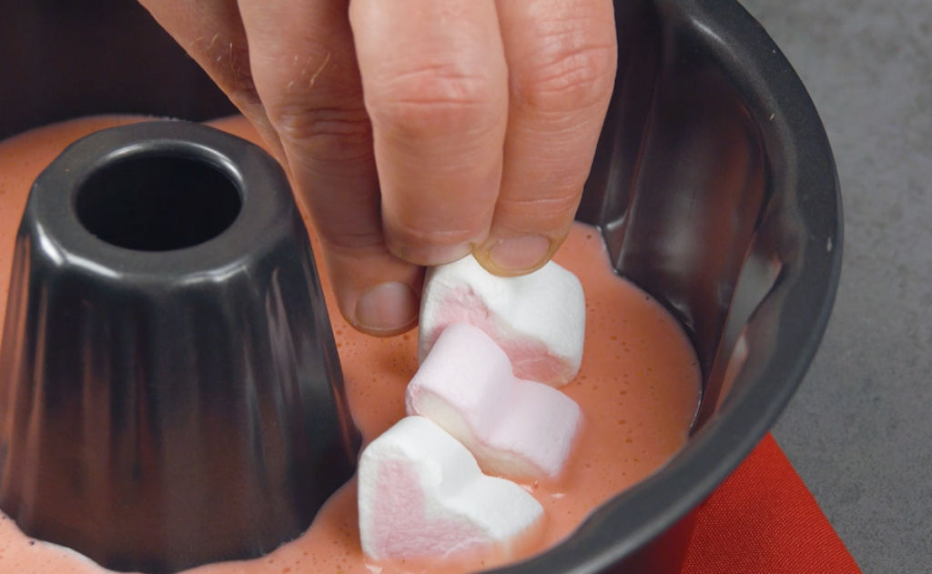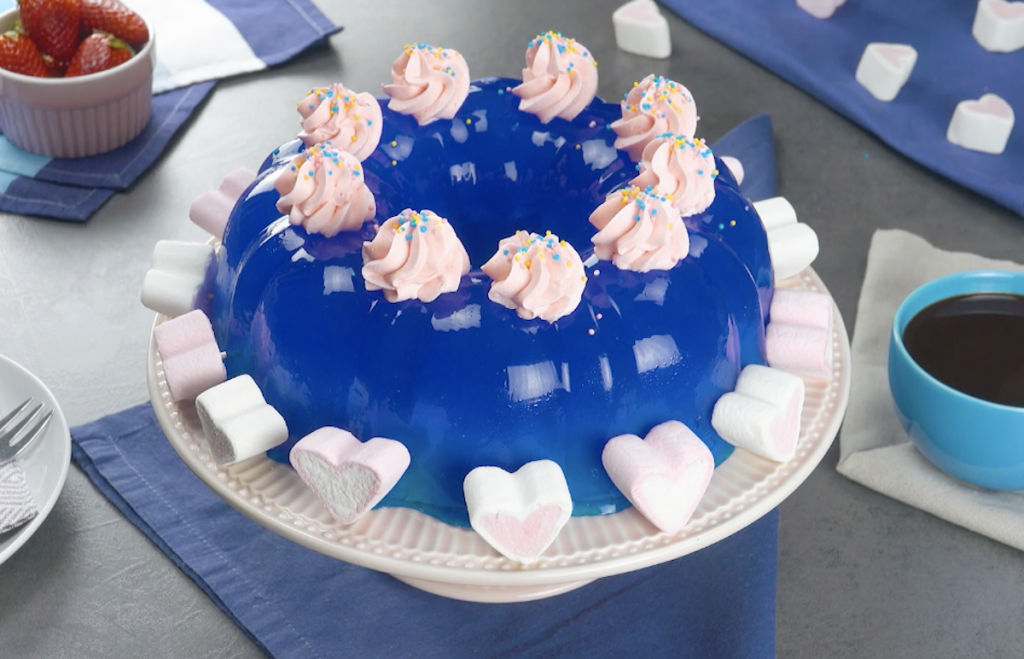 • للتقديم ، اقلب كعكة الجيلي وزينها بالمارشميلو وكريمة مخفوقة وردية