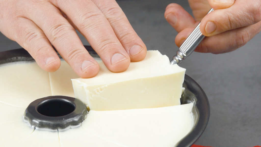 • عندما تتماسك الفانيليا ، اقطعها إلى 8 قطع بسكين في القالب واقلب كل قطعة أخرى.