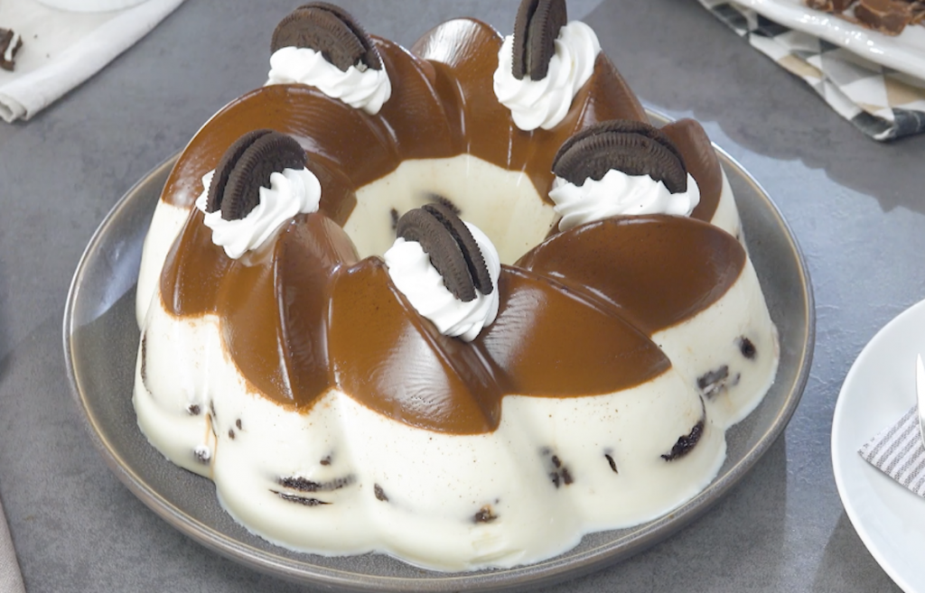 • للتقديم ، اقلب كعكة الجيلي وزينها بالكريمة المخفوقة وكوكيز الأوريو.