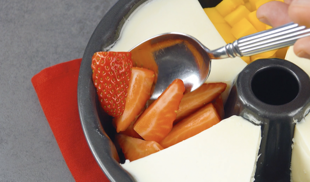 • يُسكب هلام الفاكهة الشفاف فوق الفاكهة ويُترك في الثلاجة لمدة ساعتين أخريين (يُفضل طوال الليل).