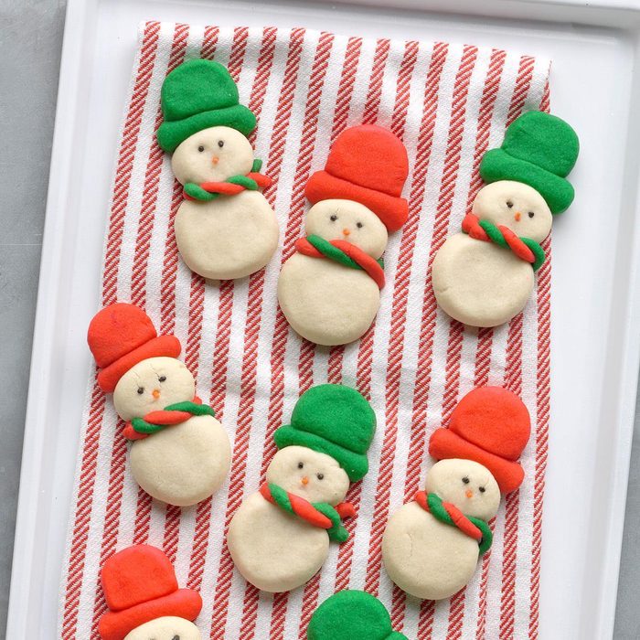 • لكل رجل ثلج ، شكل 2 ملاعق صغيرة من العجين الملون في قبعة ؛ ضع فوق الرأس.