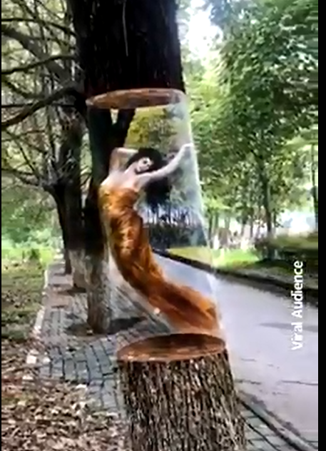 ومن خلال متابعتك لمقطع الفيديو ستشاهد مجموعه من الرسومات المذهلة علي جذع الشجر ويبدو أن هذه الصور غير العادية حيث تظهر شجرة تحوم في الهواء وعليها صورة مذهلة كالحورية أو قلم رصاص وغير ذلك وتظهر كأنه تم قطع جزء من جذع الشجرة لكنه في الحقيقة خداع بصري ذكي - تم إنشاؤه باستخدام ليس أكثر من قطعة من البلاستيك وبعض الطلاء بالرش وكان الإبداع السريالي من بنات أفكار مصممي الجرافيك دانيال سيرينج وماريو شوستر ، من بوتسدام في ألمانيا.