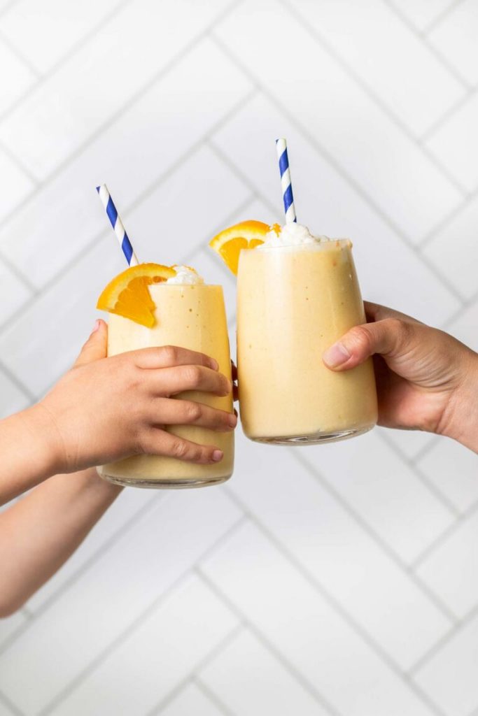 • أضف البرتقال المقشر والموز المجمد ومكعبات الثلج واختيارك من الحليب (يمكن إضافة عصير البرتقال للحصول على عصير أكثر حلاوة) ومسحوق البروتين الاختياري والفانيليا في الخلاط. يعمل هذا بشكل أفضل في الخلاط عالي السرعة ، ولكن يمكن صنعه في خلاط قياسي عالي الجودة.