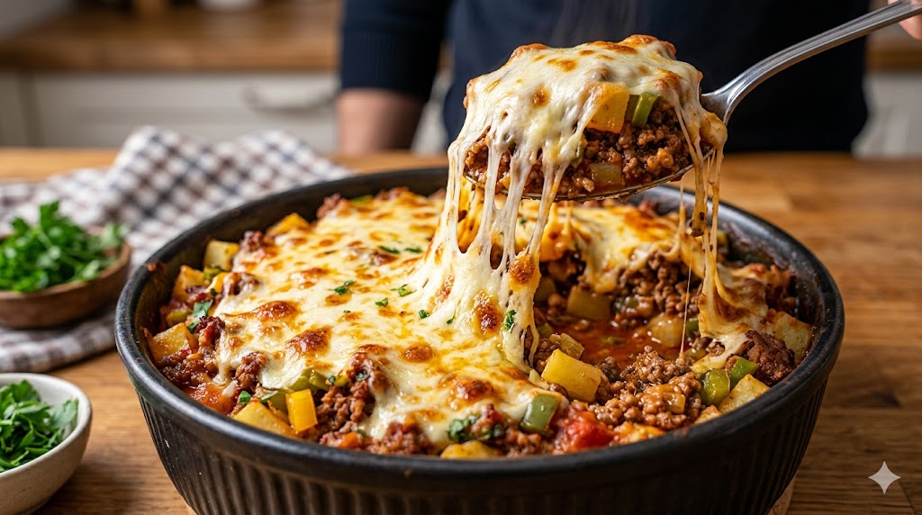 لو عندك بطاطس وشوية لحمة مفرومة.. لازم تجربى الاختراع ده! طاجن لحم بقري مفروم وبطاطس شهي واقتصادي، يتكون من طبقات من اللحم البقري المفروم المتبل، وشرائح البطاطس الرقيقة، وصلصة كريمية، وجبن ذائب يُشعرك بالراحة في كل لقمة.