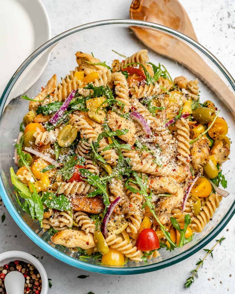 وصفة سلطة المكرونة و الدجاج وصفة صحية ويسهل إعدادها ووجبة متوازنة ستجعلك ممتلئًا وراضًا وهي مصنوعة من مكونات منعشة ومغذية بكمية مثالية من البروتين ومحضرة من أعشاب طازجة ، مكرونة ، طماطم ، زيتون ، فلفل ، جبنة بارميزان ، ثوم ، دجاج ، ثم يتم تقليبها بصلصة سلطة باستا بسيطة.