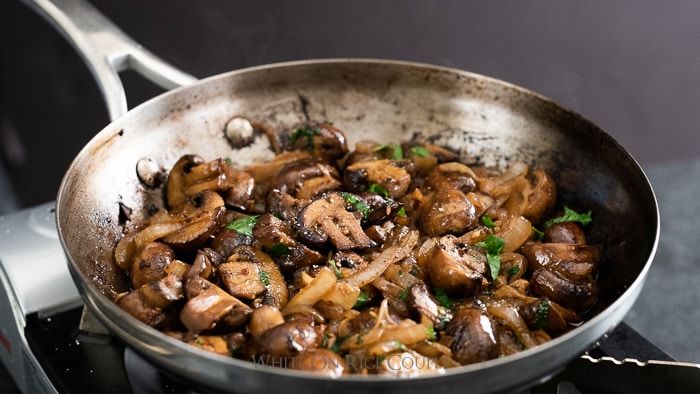 • يُطهى الفطر ويقلب حتى يبدأ في التحول إلى اللون البني والكراميل حوالي 3-5 دقائق.