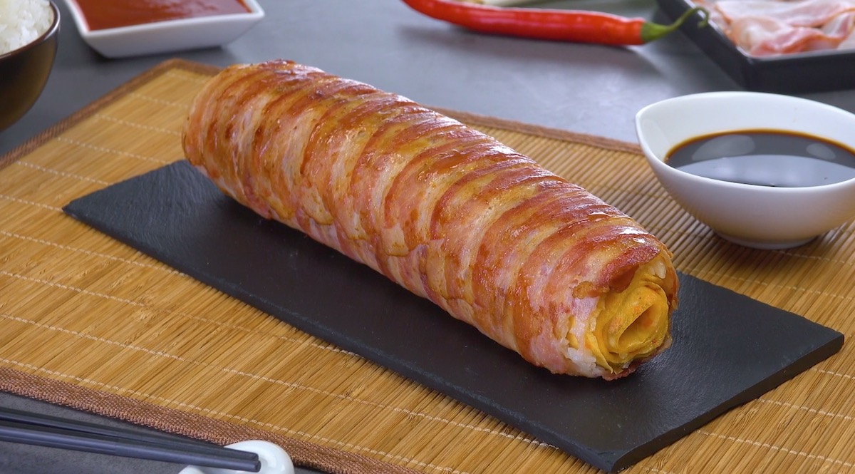 - ضع شرائح لحم مقدد على حصيرة السوشي ، متداخلة معها.