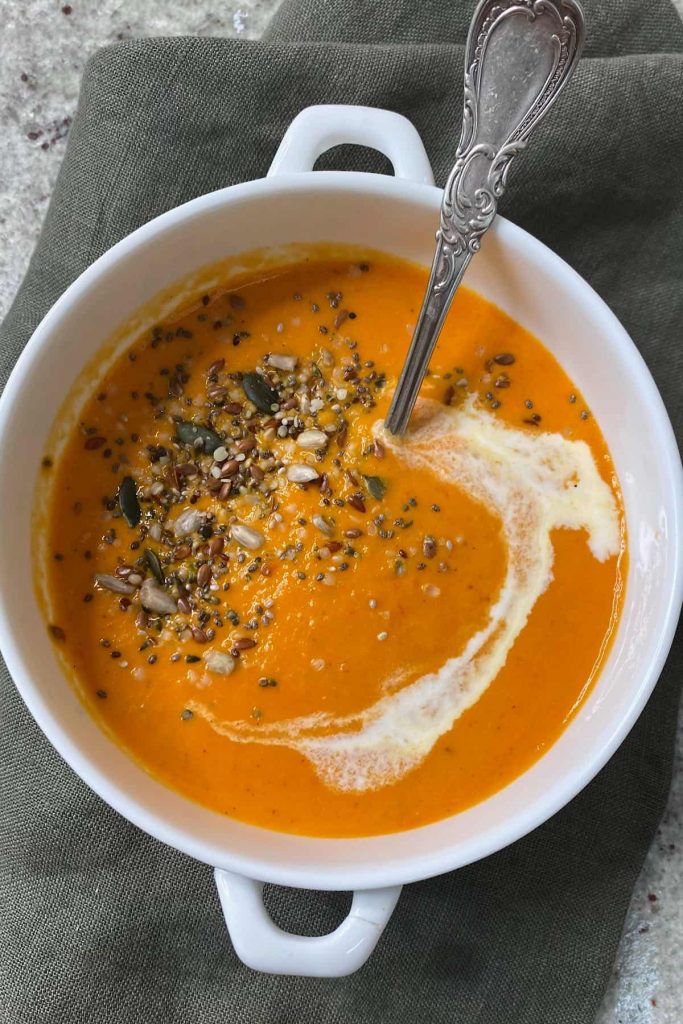 تأتي الطماطم والفلفل ساخنين من الفرن وطالما لم تضيفي مرق الخضار والكريمة مباشرة من الثلاجة (درجة حرارة الغرفة رائعة) ، سيكون الحساء ساخنًا بدرجة كافية للاستهلاك. إذا كنت لا تزال تشعر بالحاجة إلى التسخين ، ضعه في مقلاة كبيرة وقم بتسخينه على نار متوسطة.