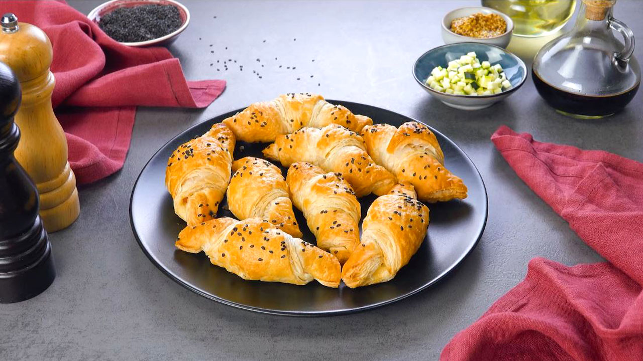 - أخيرًا ، نرش بذور السمسم الأسود على الكرواسون وضعها في الفرن لمدة 20 دقيقة تقريبًا عند 190 درجة مئوية