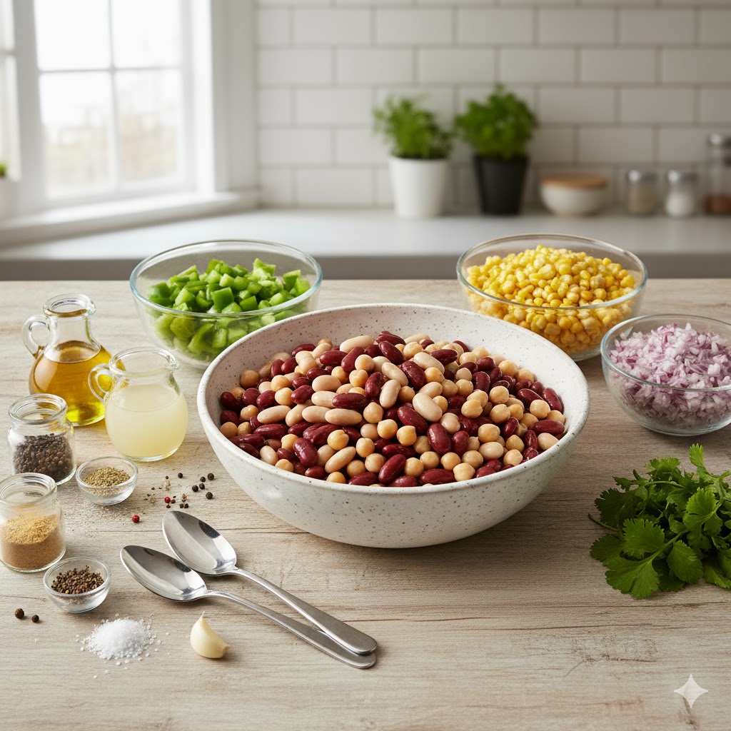 سلطة الفاصوليا الخارقة: مصدر بروتين نباتي سهل التحضير (أقل من 10 دقائق!) إليك وصفة "سلطة الفاصوليا الكثيفة المتبلة" التي تجمع بين أنواع مختلفة من الفاصوليا والخضروات لزيادة محتواها من البروتين والألياف، بالإضافة إلى تتبيلة منعشة ومميزة.