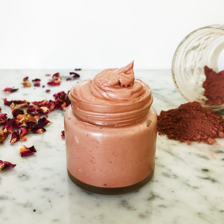 - يُضاف زيت المشمش المنقوع ، والطين الوردي والزيوت العطرية. امزج مرة أخرى ، بدءًا من السرعة المنخفضة ثم قم بالزيادة ببطء إلى السرعة العالية. استمر في الخلط حتى يمتزج الطين الوردي جيدًا مع الزبد والزيوت ويصبح المزيج خفيفًا ورقيقًا.