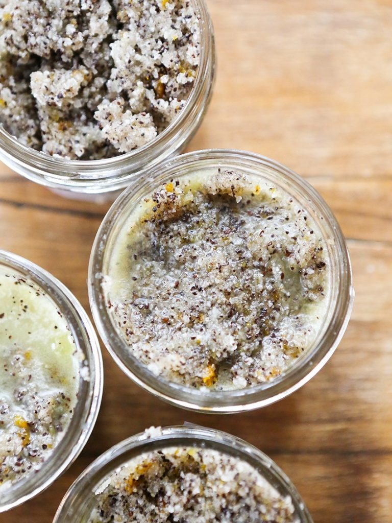 - تحتوي القهوة على خصائص مضادة للالتهابات وزيت جوز الهند مضاد للجراثيم بشكل طبيعيو يضيف نكهة الحمضيات رائحة لطيفة ومن المعروف أن الزنجبيل يحمي من الشيخوخة كلها معا تحمي وتنعم بشرتك