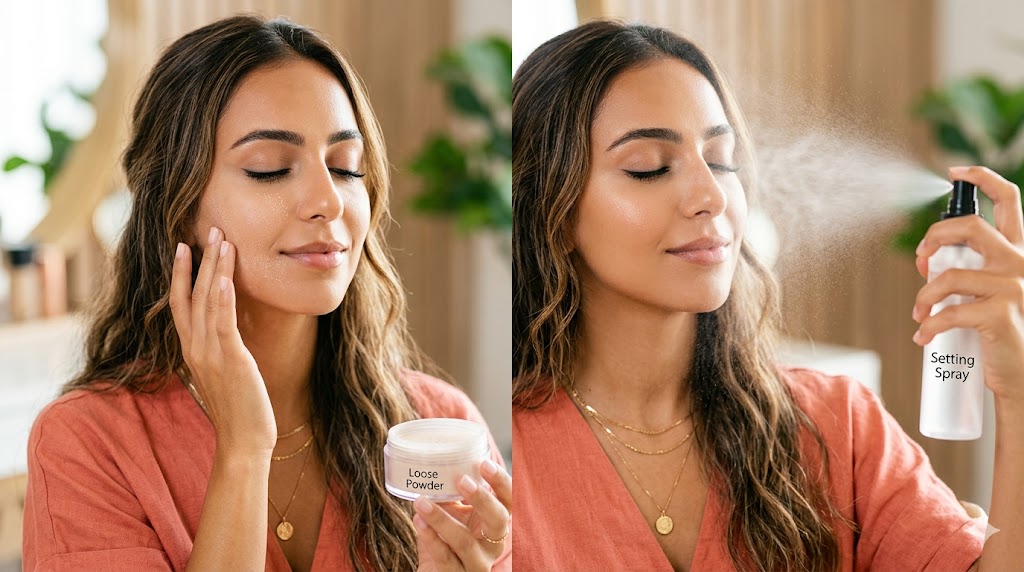 سر البشرة الفلتر: كيف تدمجين البودرة مع بخاخ التثبيت دون تكتل؟