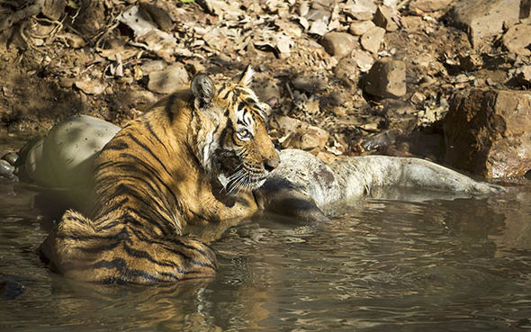 بالفيديو شاهد معركة شرسة بين نمر وتمساح